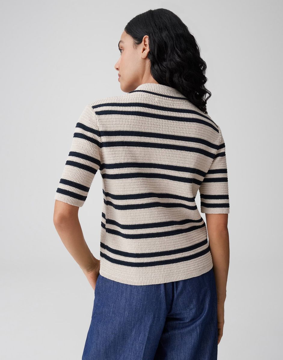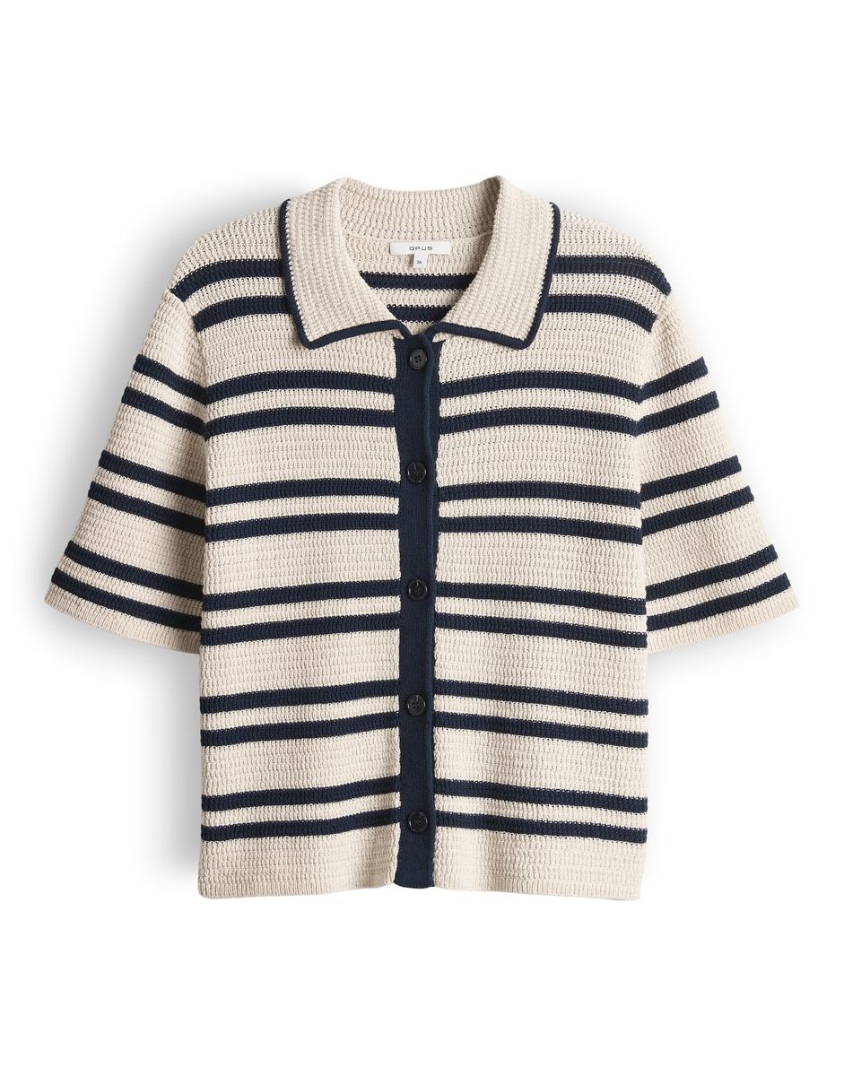 schmale Passform, gerader Schnitt, Halbarm, Umlegekragen, Rückenlänge ca. 53 cm bei Größe 36, Model Größe 175 cm – trägt Größe 36, Strick, Crochet Optik, schwerer Stoff, gestreift, Knopfleiste, kontrastreiche Konturen