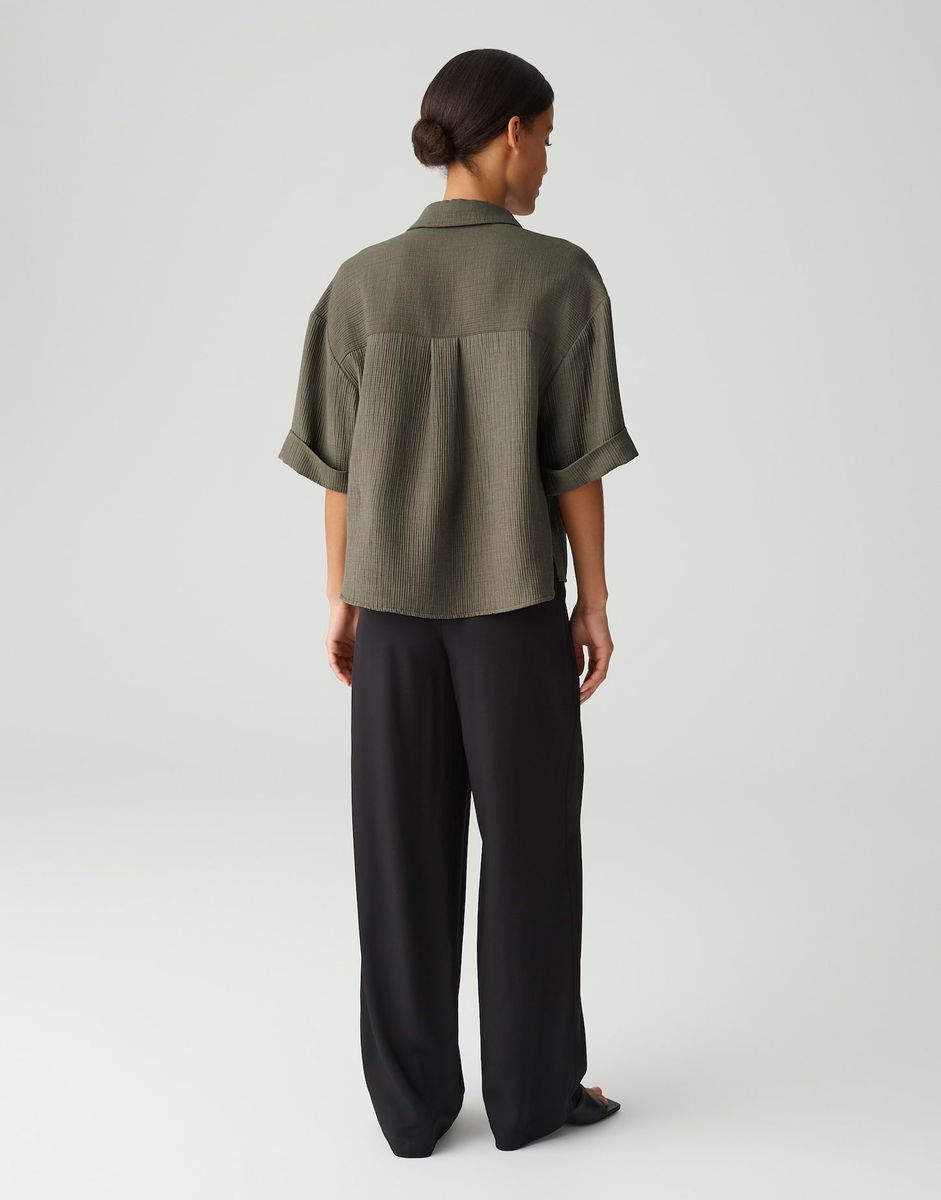 lockere Passform, gerader Schnitt, hinten länger als vorne, überschnittene Schulter mit Halbarm, V-Ausschnitt, Hemdblusenkragen, Rückenlänge ca. 62 cm bei Größe 36, Model Größe 175 cm – trägt Größe 36, Webware, enthält nichttextile Teile tierischen Ursprungs, Crinkle Optik, weicher Griff, weich fließender Fall, aufgesetzte Brusttasche, Passe mit Quetschfalte im Rücken, abgerundeter Saum, lange Knopfleiste, Schlitze in den Seiten, Perlmuttknöpfe, Aufschlag am Ärmel
