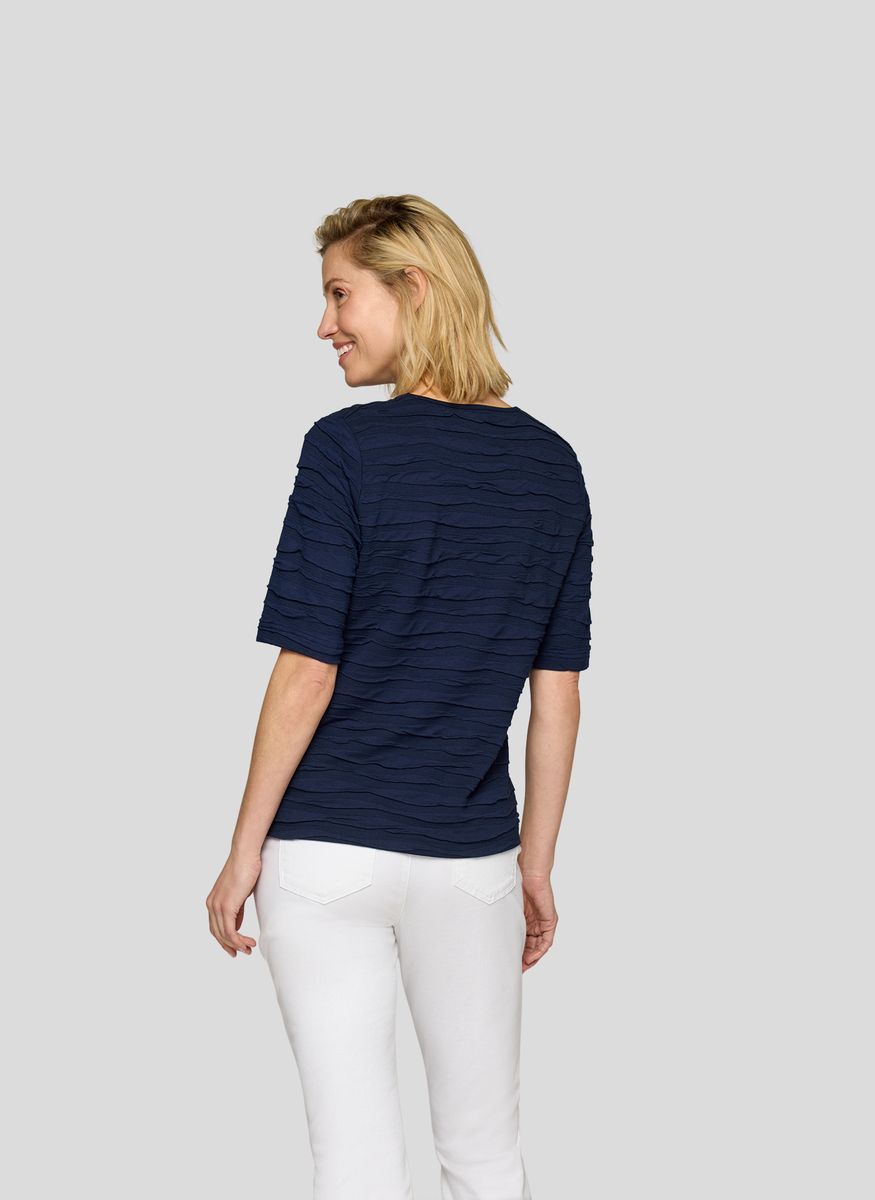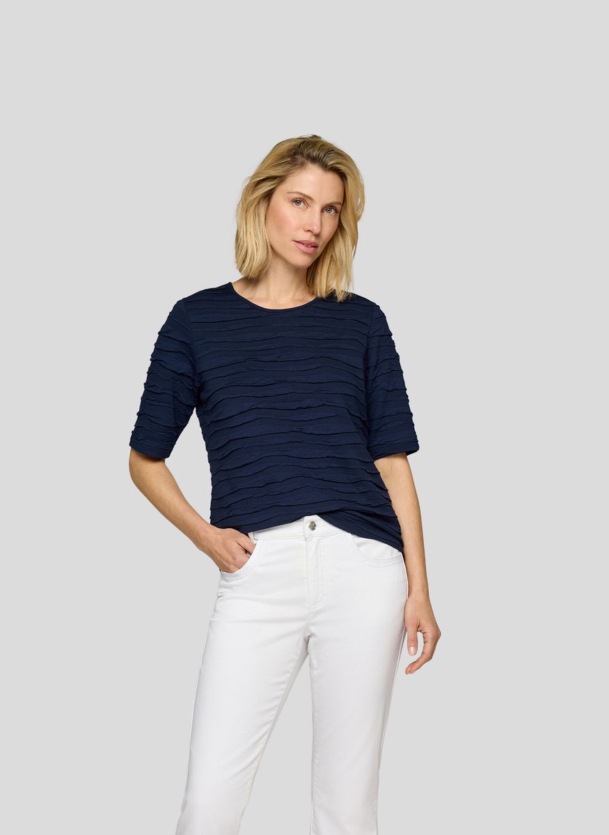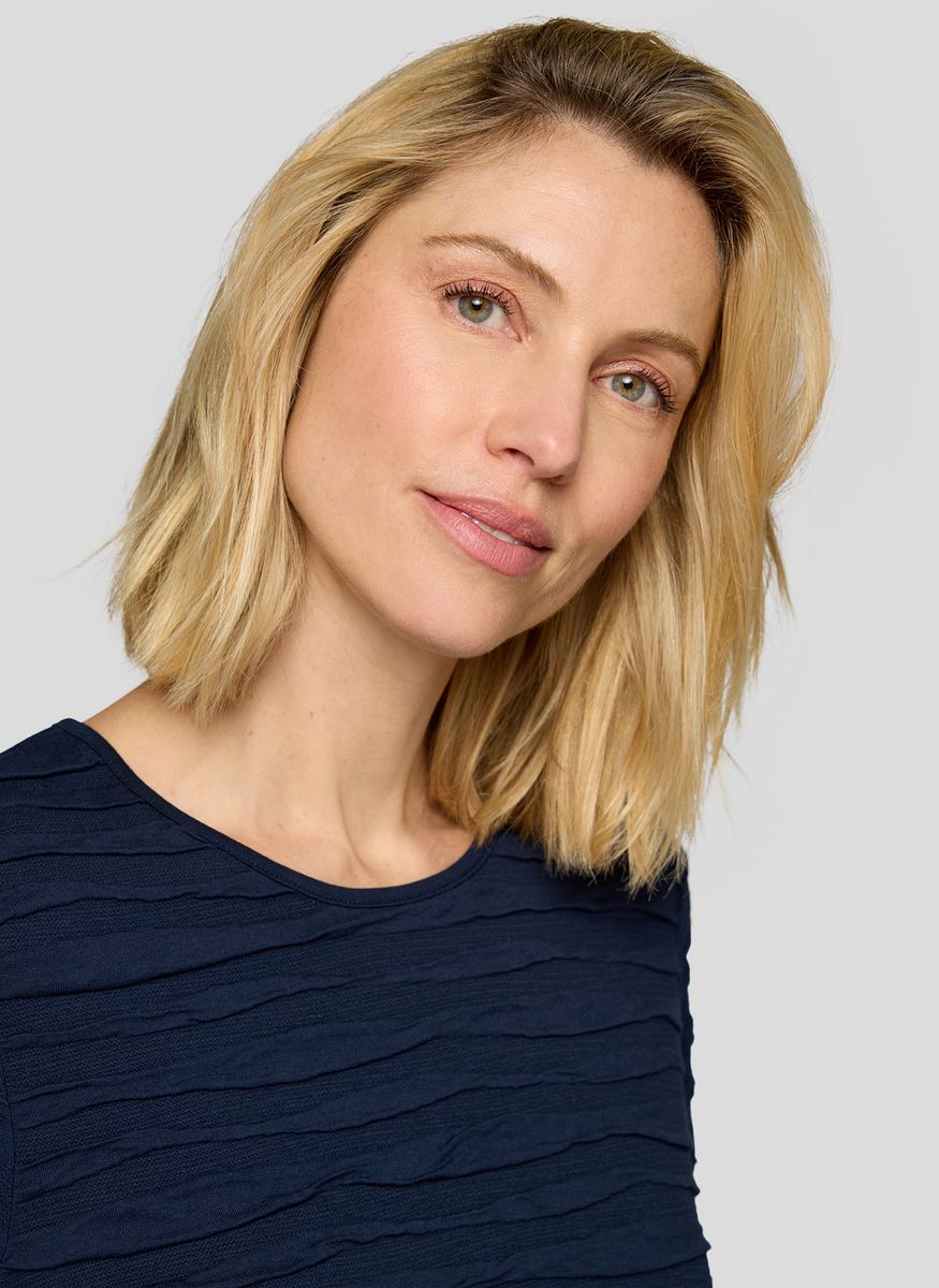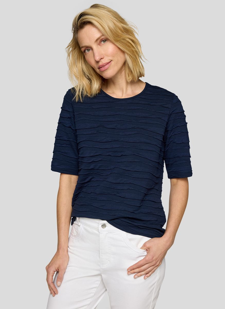 Die effektvolle Raffung im Stoff sorgt für eine lebendige Optik und schmeichelt der Figur. Die kraftvolle Farbe zieht alle Blicke auf sich und verleiht Ihrem Look eine selbstbewusste Ausstrahlung. Dank des angenehmen Materials genießen Sie gleichzeitig höchsten Tragekomfort.Strukturierter Stoff mit modischem Crinkle-Effekt.3/4-Ärmel _ perfekt für Übergangszeiten.Rundhalsausschnitt für eine klassische Note.Weich, elastisch und pflegeleicht _ ideal für jeden Tag.