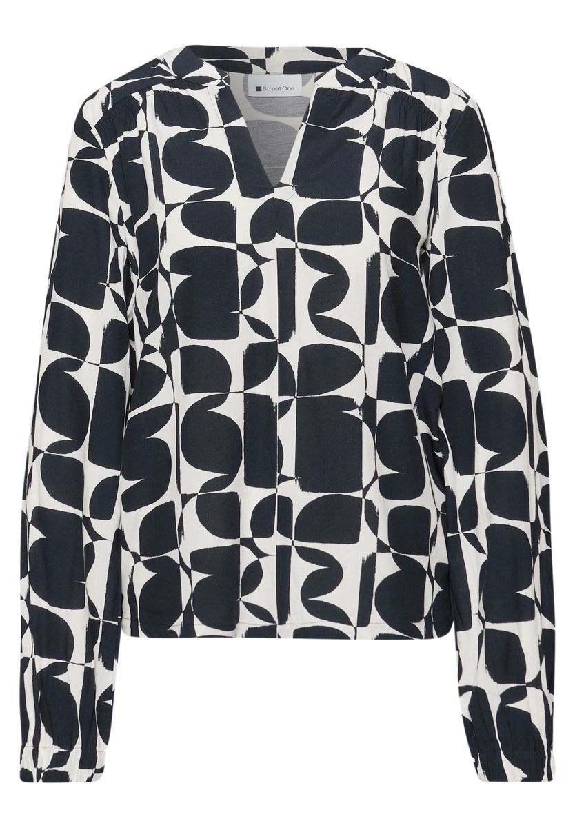 Das gemusterte Shirt im Strukturmix von Street One für Damen bringt mit Split Neck, elastischen Bündchen und grafischem Design frische Energie in deinen Look. Die Vorderseite und Ärmel bestehen aus strukturierter Viskose, das Rückenteil aus softem Jersey mit Stretchanteil – für maximalen Komfort. Der leicht gerundete Saum verleiht dem Shirt eine moderne Silhouette. Strukturmix Shirt Casual Split Neck Langarm Bequem Material: Vorderseite: 100% Viskose; Ärmel: 100% Viskose; Rückseite: 95% Viskose, 5% Elasthan