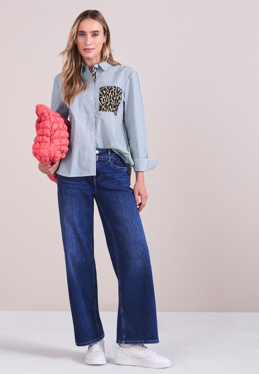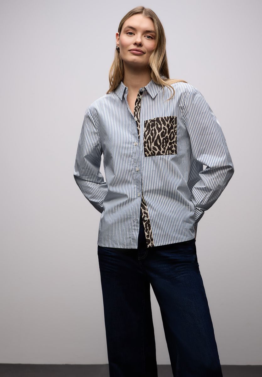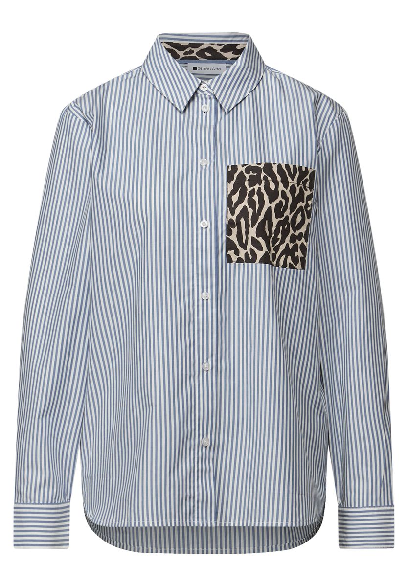Die gestreifte Hemdbluse von Street One für Damen überzeugt mit klassischen Linien und einem modernen Twist. Der Leo-Print an der Brusttasche setzt einen spannenden Akzent, während die reine Baumwolle für angenehmen Tragekomfort sorgt. Ein stilvoller Begleiter für Alltag und Büro. Baumwollbluse Casual Hemdkragen Langarm Modisch Material: 100% Baumwolle
