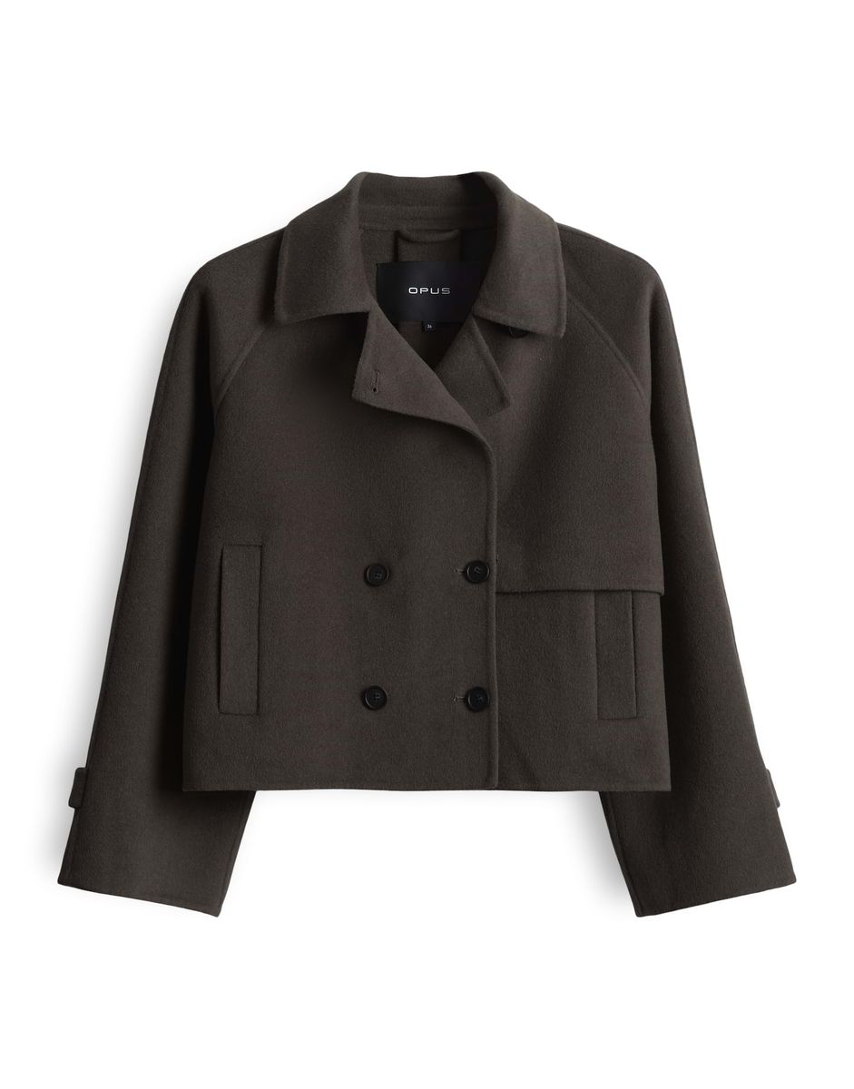 lockere Passform, leicht ausgestellt geschnitten, verkürzte Länge, Langarm, Reverskragen, Rückenlänge ca. 56 cm bei Größe 36, Model Größe 172 cm – trägt Größe 36, Webware, ungefüttert, weicher Griff, wärmender Stoff, Paspeltaschen vorne, Kellerfalte, zweireihige Knopfleiste, Raglanärmel, Riegel an der Manschette, Knöpfe in Horn Optik