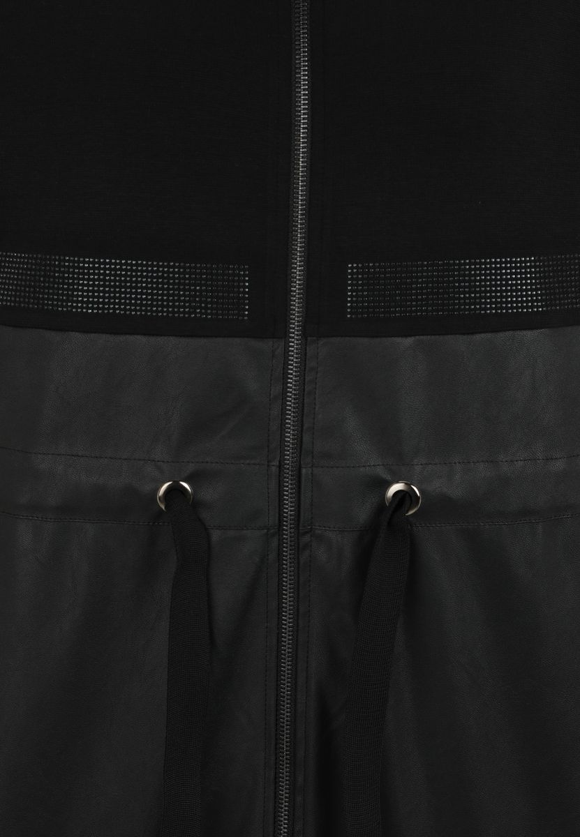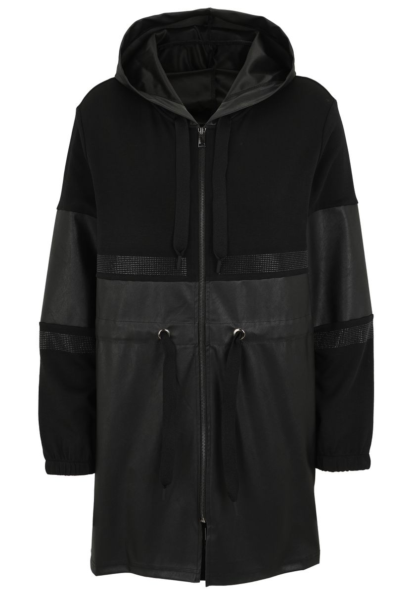 Diese lässige Long-Jacke mit Hoodie von Doris Streich ist aus softem Lederimitat im Mix mit elastischem Punto di Roma Wirkware gefertigt. Der tonige schwarze Strass, der Reißverschluss und die Ösen mit Band runden den Look ab.
