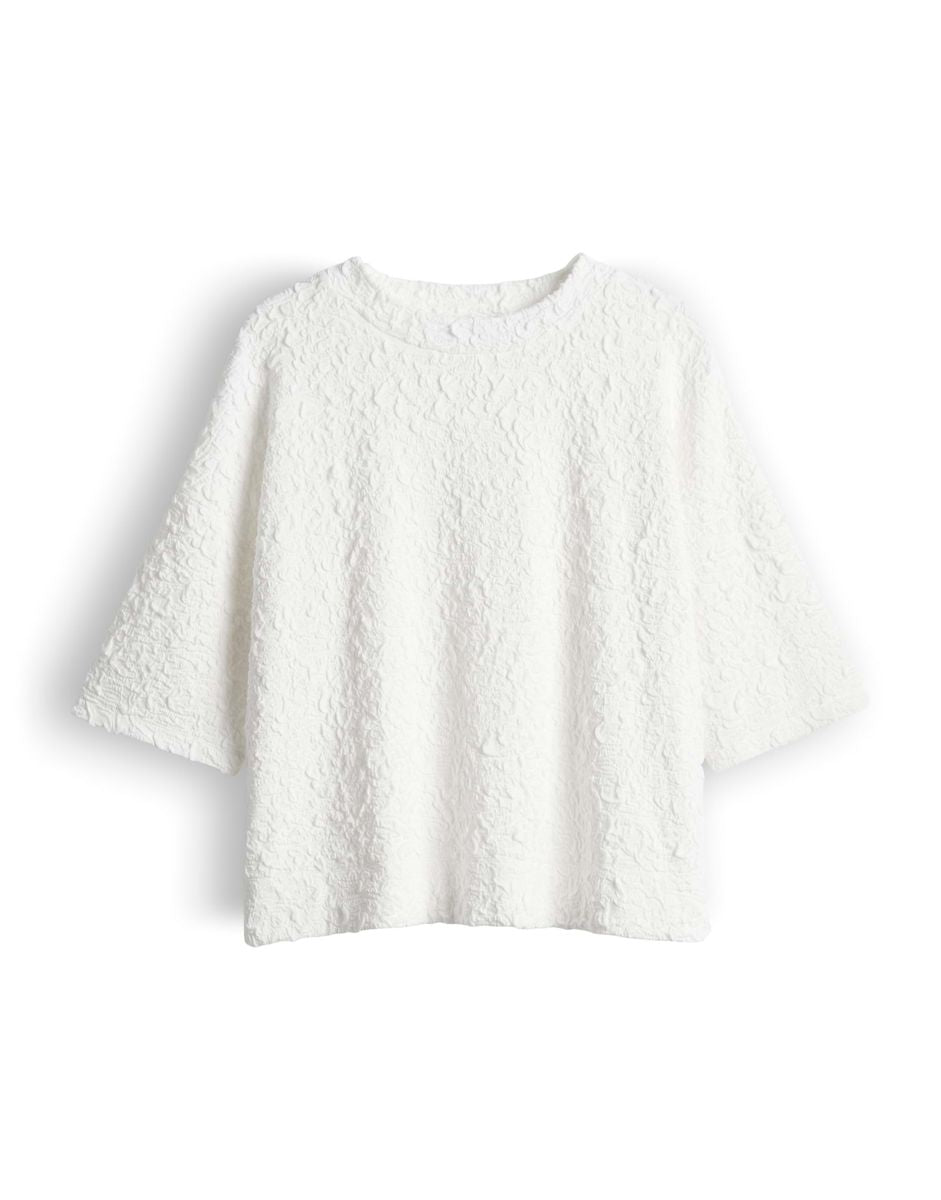 lockere Passform, gerader Schnitt, verkürzte Länge, überschnittene Schulter mit Kurzarm, hoher Rundhalsausschnitt, Rückenlänge ca. 52 cm bei Größe 36, Model Größe 175 cm – trägt Größe 36, Jersey, 3-dimensionale Struktur, weicher Griff, elastischer Stoff, kleine Schlitze in den Seiten