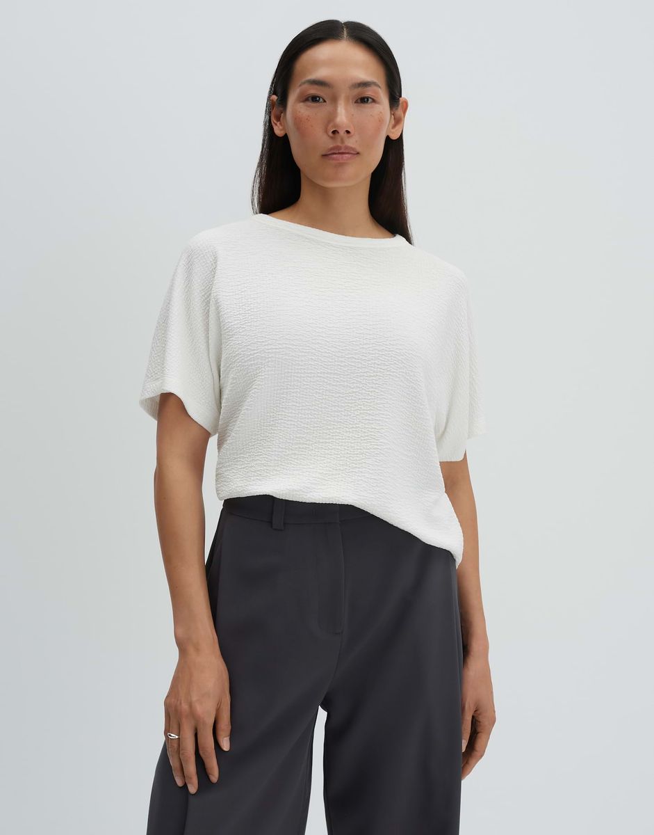 lockere Passform, gerader Schnitt, überschnittener Kurzarm, Rundhalsausschnitt, Rückenlänge ca. 56 cm bei Größe 36, Model Größe 175 cm – trägt Größe 36, Jersey, leichte Crash Optik, weicher Griff, leichte Transparenz im hellen Farbton