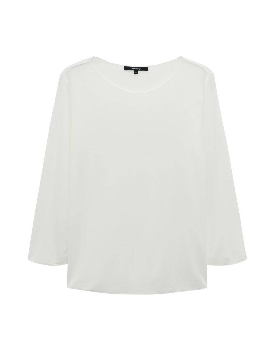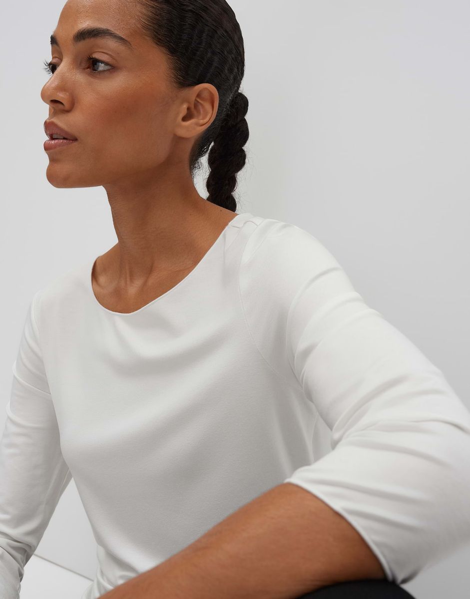 schmale Passform, gerader Schnitt, normale Länge, 3/4 Arm, weiter Rundhalsausschnitt, Rückenlänge ca. 56 cm bei Größe 36, Model Größe 179 cm – trägt Größe 36, ECOVERO™ Viskose Mix, Jersey, weicher Griff, fließender Fall, Rollkanten