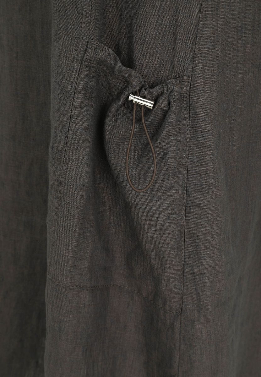 Das Kleid von Doris Streich ist aus softem Leinen-Gewebe gefertigt. Die zwei großen Taschen mit Tunnelzug, die silberfarbene unterlegte Öse am Halsausschnitt und die hochgeschlagenen kurzen Ärmel runden das Modell ab. Die ausgestellte A-Linie bietet