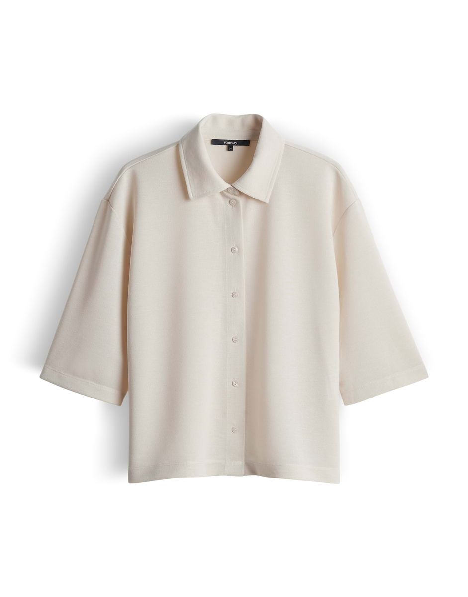weite Passform, Boxy Silhouette, leicht verkürzt geschnitten, überschnittene Schulter mit Kurzarm, Hemdblusenkragen, Rückenlänge ca. 55 cm bei Größe 36, Model Größe 175 cm – trägt Größe 36, Jersey, Strickoptik, weicher Griff, elastisch, Knopfleiste