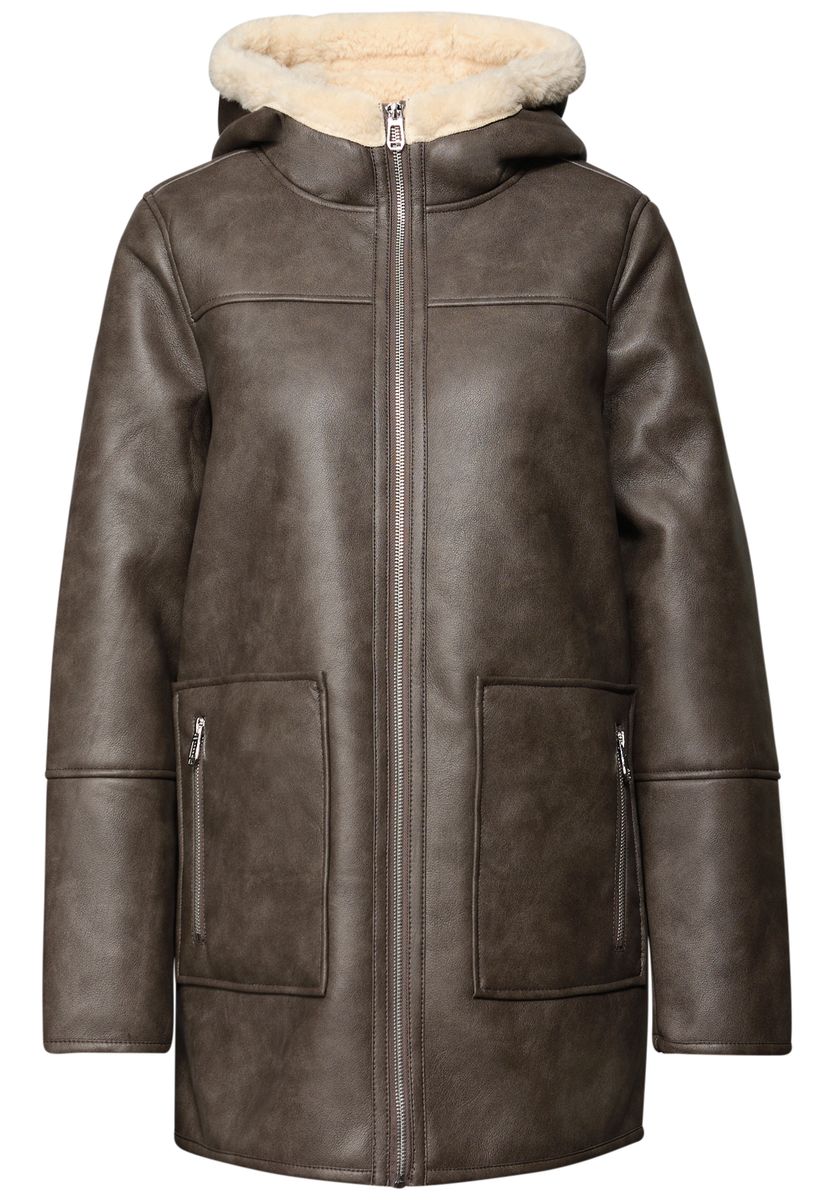 Diese Jacke von Street One für Damen begeistert mit coolem Leder-Look und modischen Details. Eine Kapuze mit Fake Fur Akzenten, seitliche Zipper-Taschen und ein Reißverschluss machen sie zum stylischen Begleiter. Die Kombination aus edgy Optik und weicher Haptik sorgt für einen modernen Auftritt mit Wohlfühlfaktor. Damenjacke Kapuze Seitliche Taschen mit Zipper Fake Fur Details Reißverschluss Material: Obermaterial: 100% Polyester; Futter: 100% Polyester