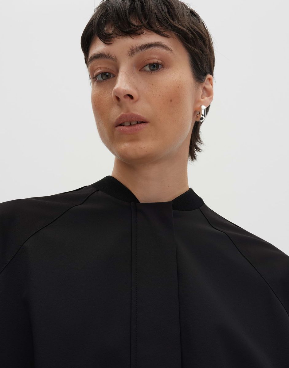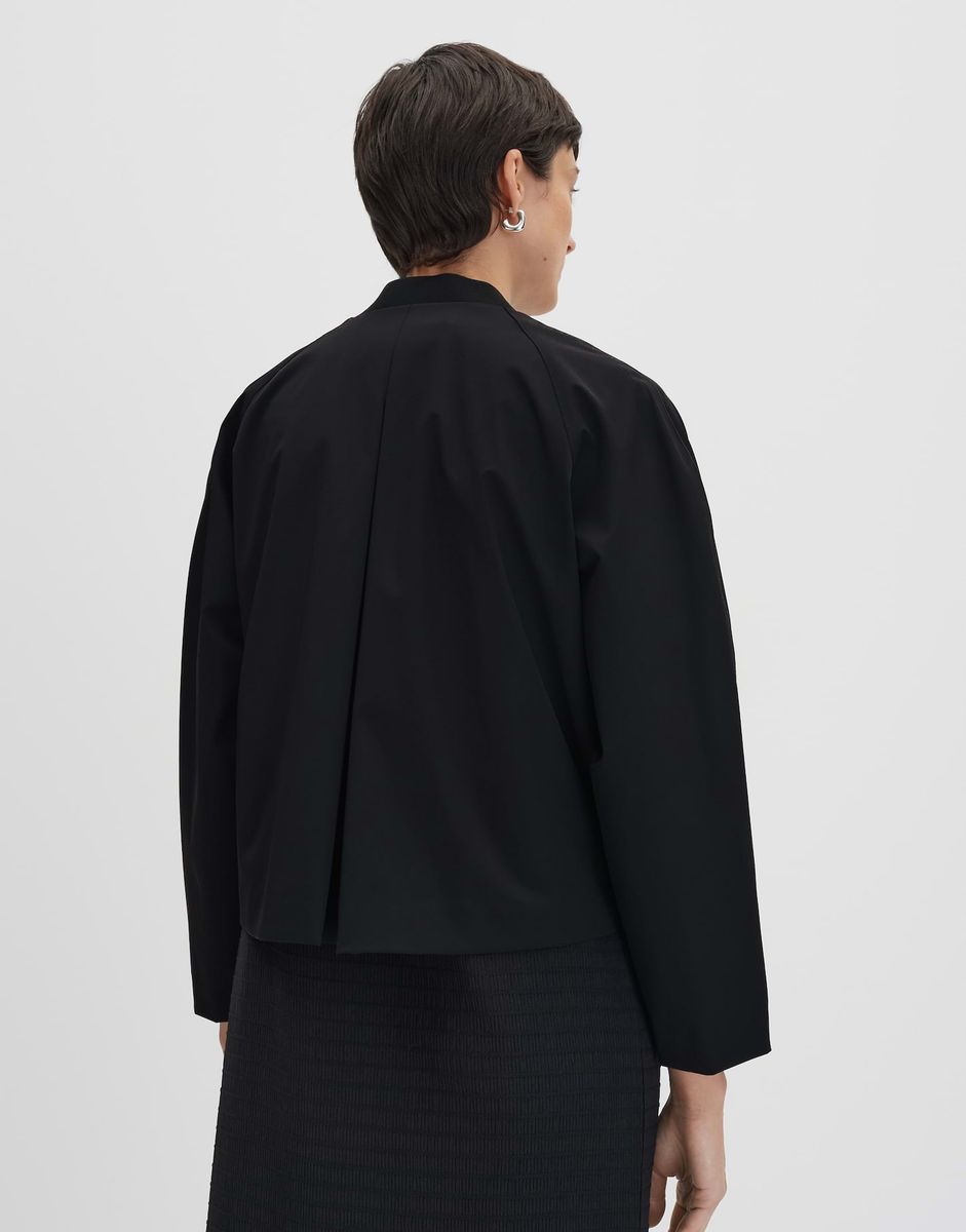 lockere Passform, gerader Schnitt, verkürzte Länge, verkürzter Arm, Blousonkragen, Rückenlänge ca. 56 cm bei Größe 36, Model Größe 178 cm – trägt Größe 36, Webware, glatter Griff, leicht elastischer Stoff, matter Glanz in der Oberfläche, ungefüttert, schräge Paspeltaschen, Kellerfalte im Rücken, Tunnelzug im Saum, verdeckte Knopfleiste