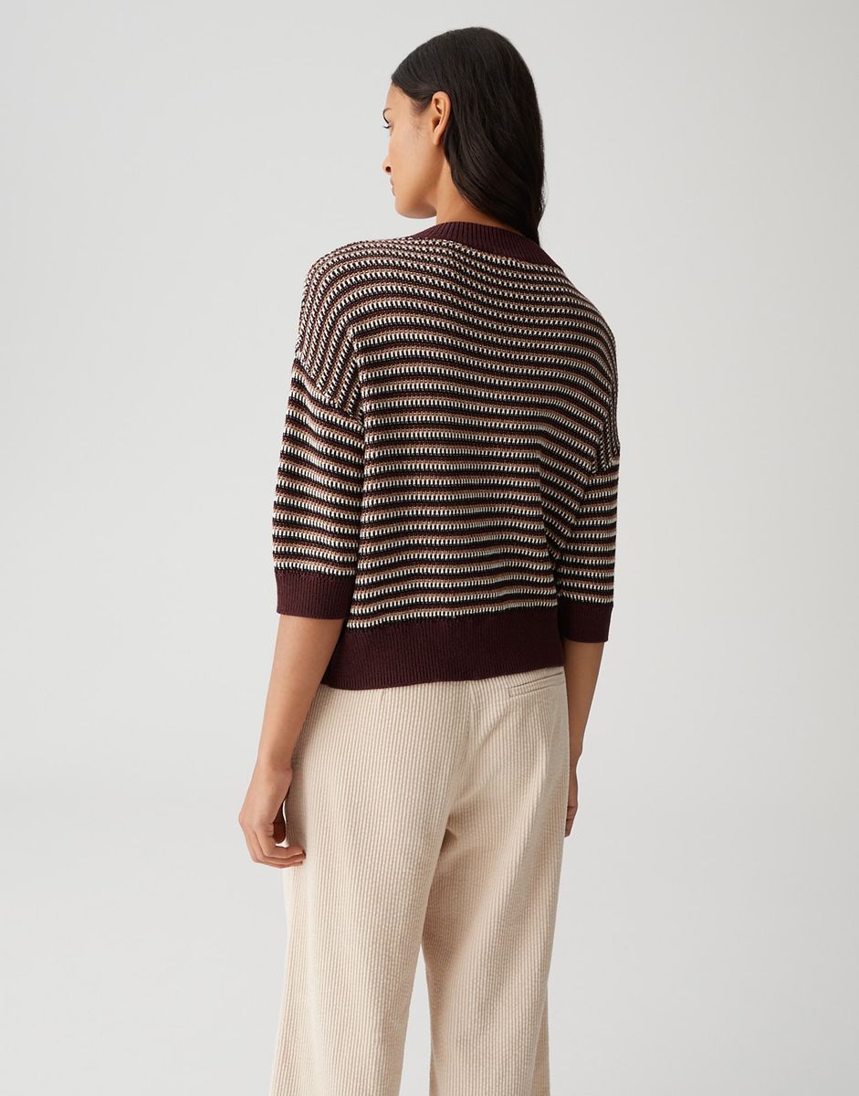 lockere Passform, Boxy Silhouette, leicht verkürzt geschnitten, 3/4 Arm, Rundhalsausschnitt, Rückenlänge ca. 51 cm bei Größe S, Model Größe 178 cm – trägt Größe S, Strick, Jacquard Struktur, weicher Griff, Strickbündchen