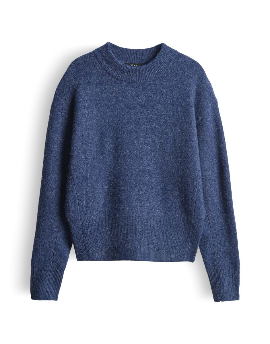 lockere Passform, schmal zulaufend, leicht verkürzt geschnitten, überschnittene Schulter mit Langarm, Stehkragen, Rückenlänge ca. 54 cm bei Größe 36, Model Größe 177 cm – trägt Größe 36, Strick, weicher Griff, elastisch, Strickbündchen