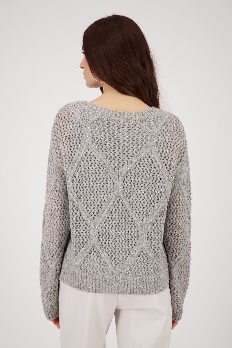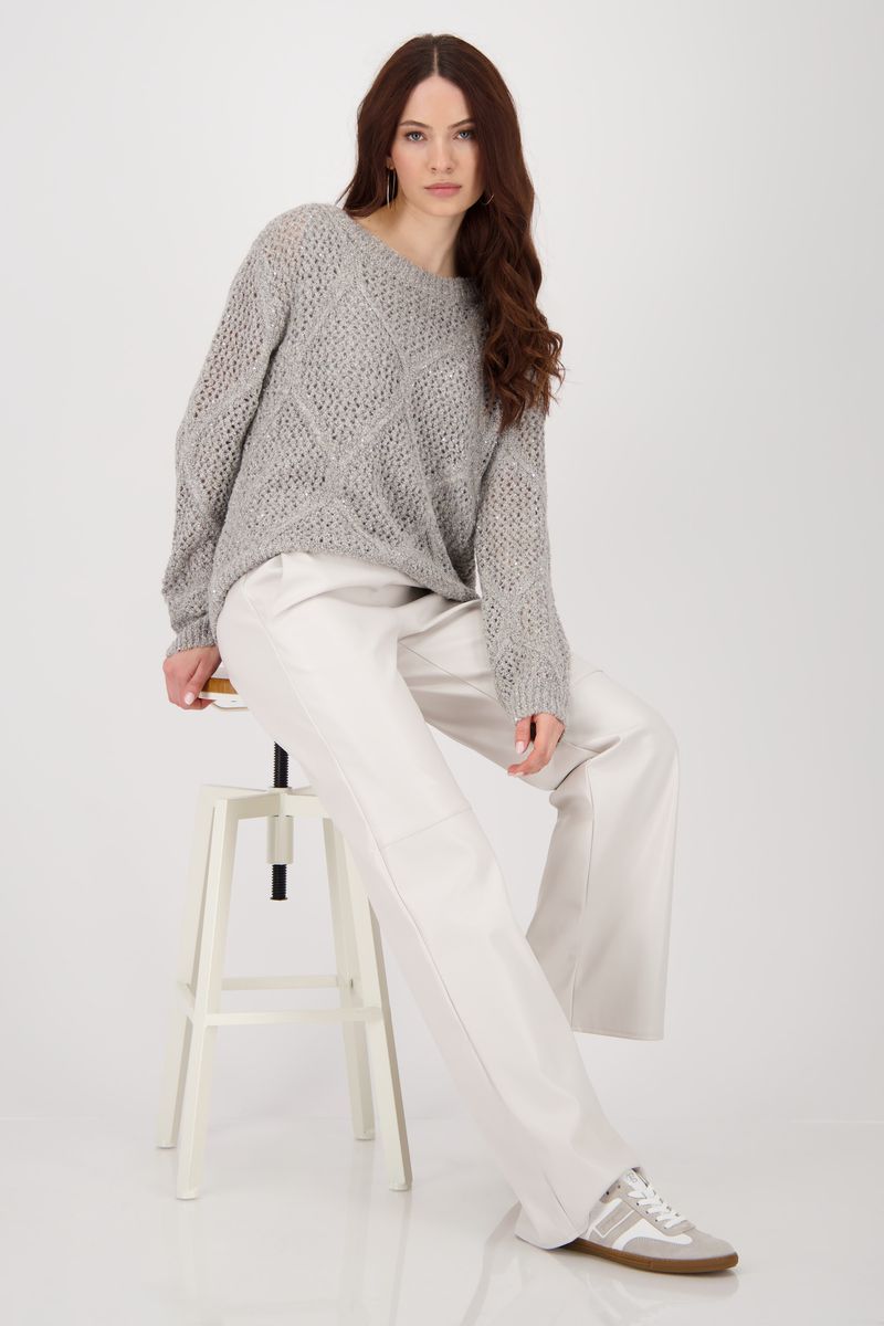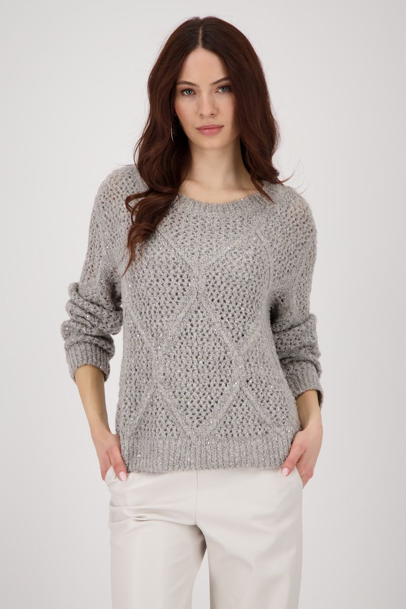 Eleganter Ajour-Pullover aus hochwertiger Baumwollmischung mit fließender Viskose, glitzerndem Lurex und Pailletten. Überschnittene Schultern und feines Ajourmuster verleihen ihm eine feminine, stilvolle Ausstrahlung.