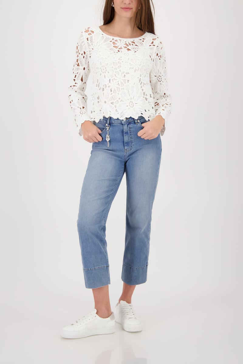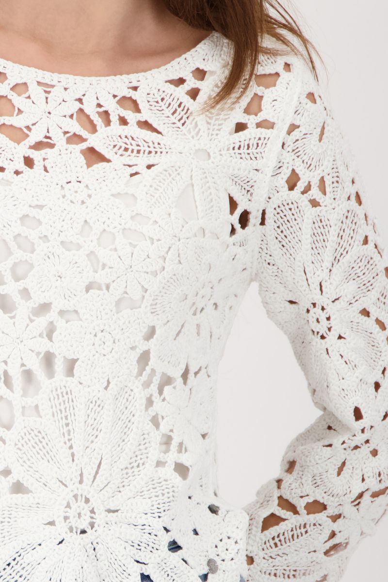 Eleganter Strickpullover aus 100% Viskose, mit zauberhaftem Cornelly-Muster, Rundhalsausschnitt und modischen ⅞-Ärmeln.