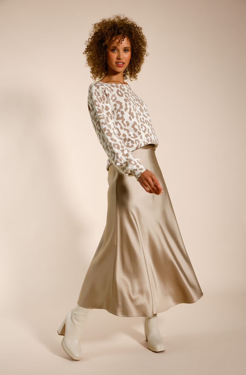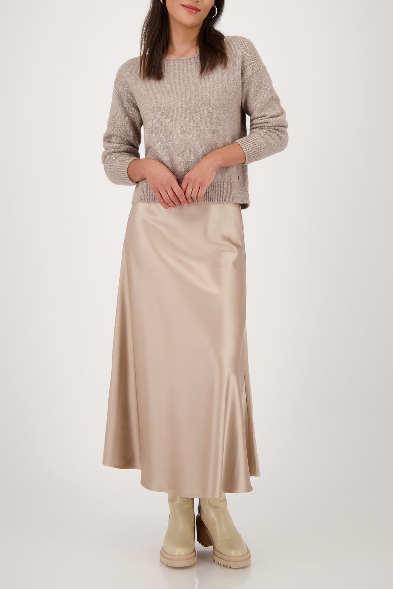 Eleganter Satinrock in Midi-Länge, aus elastischem Material mit fließendem Fall und komfortablem Taillenband – für einen stilvollen Auftritt.