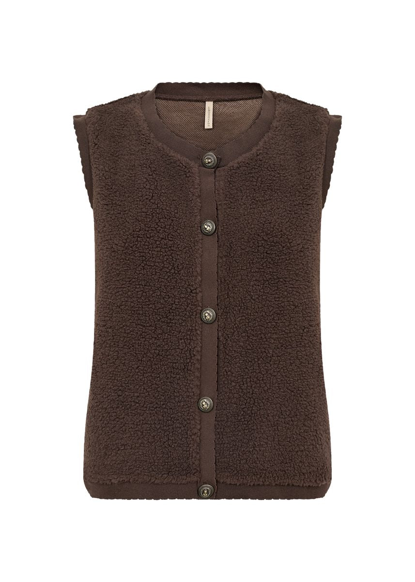Die SC-ONYX 6 Weste ist aus 100 % recyceltem Polyester gefertigt. Sie hat einen Rundhalsausschnitt, einen Knopfverschluss vorne und eine strukturierte Oberfläche. Kombiniere sie mit Jeans und einem langärmeligen Oberteil für einen mehrschichtigen Look.