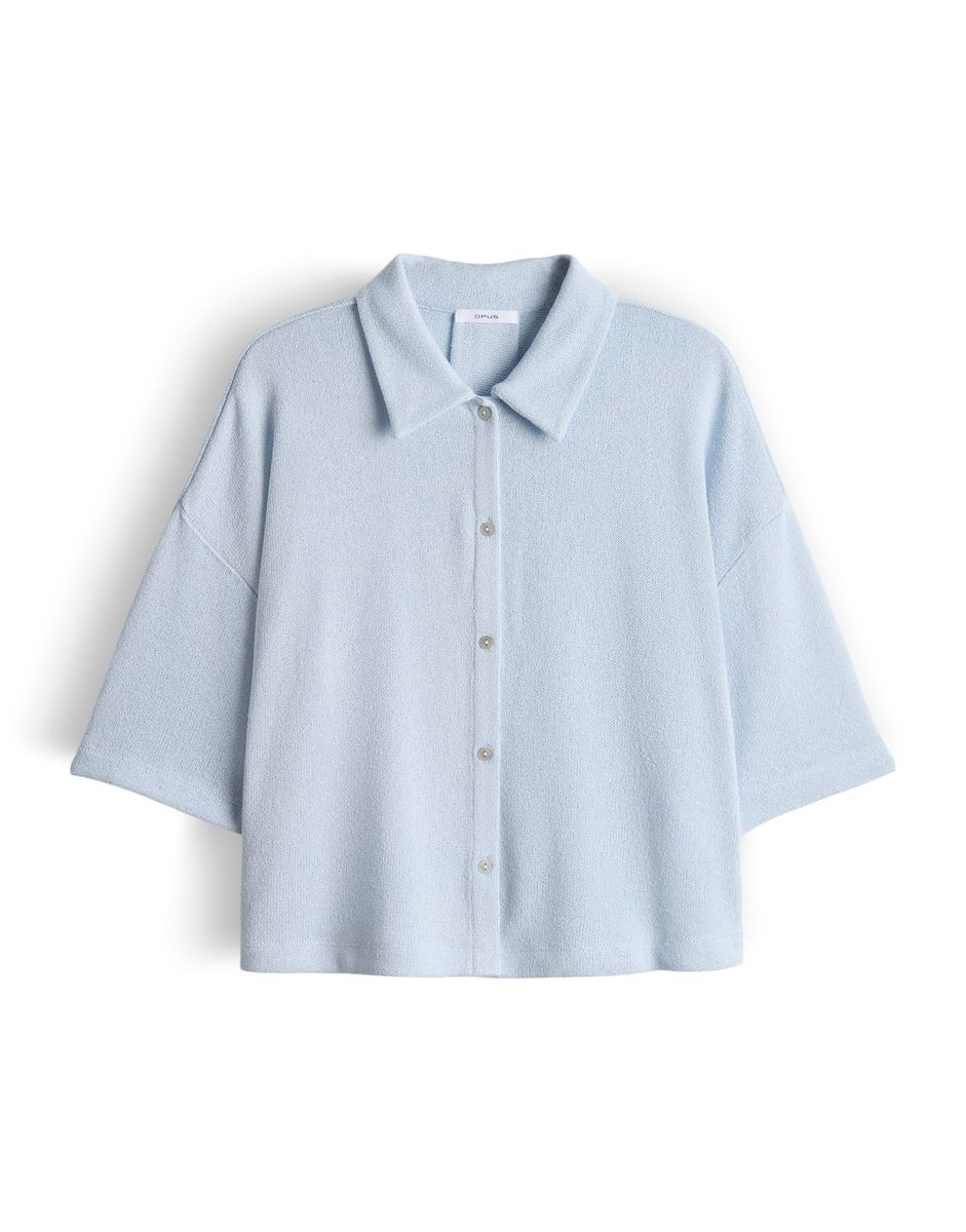 lockere Passform, gerader Schnitt, verkürzte Länge, überschnittene Schulter mit Kurzarm, Polokragen, Rückenlänge ca. 52 cm bei Größe 36, Model Größe 177 cm – trägt Größe 36, Jersey, Strick Optik, natürlicher Griff, leichte Transparenz im hellen Farbton, Kellerfalte im Rücken, Knopfleiste