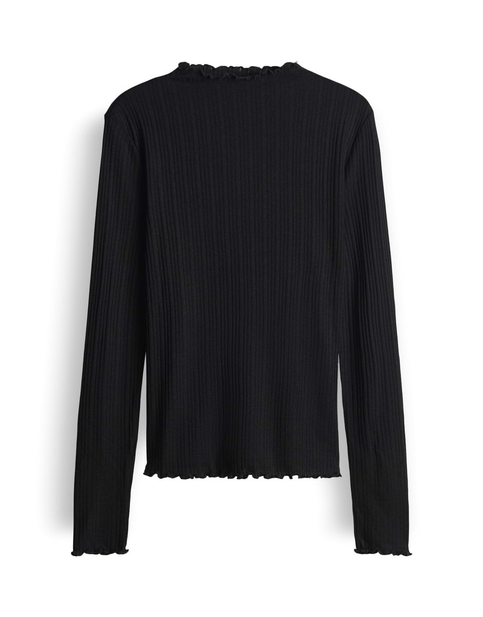 schmale Passform, figurbetont geschnitten, Langarm, Stehkragen, Rückenlänge ca. 62 cm bei Größe 36, Model Größe 177 cm – trägt Größe 36, Jersey, Rippstruktur, weicher Griff, leichte Transparenz, elastisch, gewellte Kurbelkante