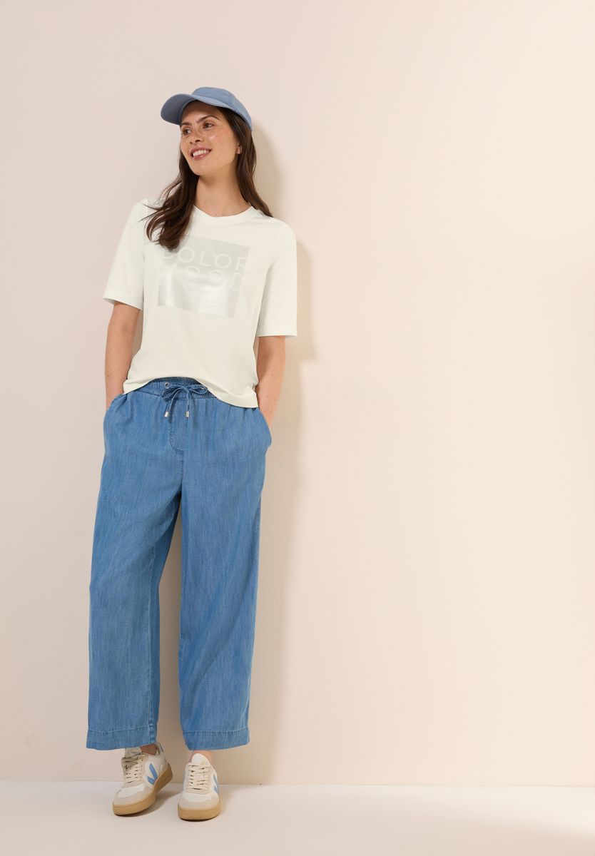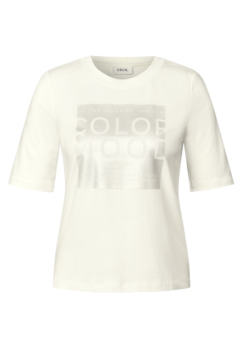 Dieses T-Shirt von CECIL für Damen setzt mit seinem dezent schimmernden Folienprint modische Akzente. Der Rundhalsausschnitt und der elastische Modalmix mit Stretch sorgen für einen bequemen Sitz. T-Shirt Rundhalsausschnitt Kurzarm Dezent schimmernder Folienprint Modalmix mit Stretchanteil Material: 63% Modal, 35% Baumwolle, 2% Elasthan