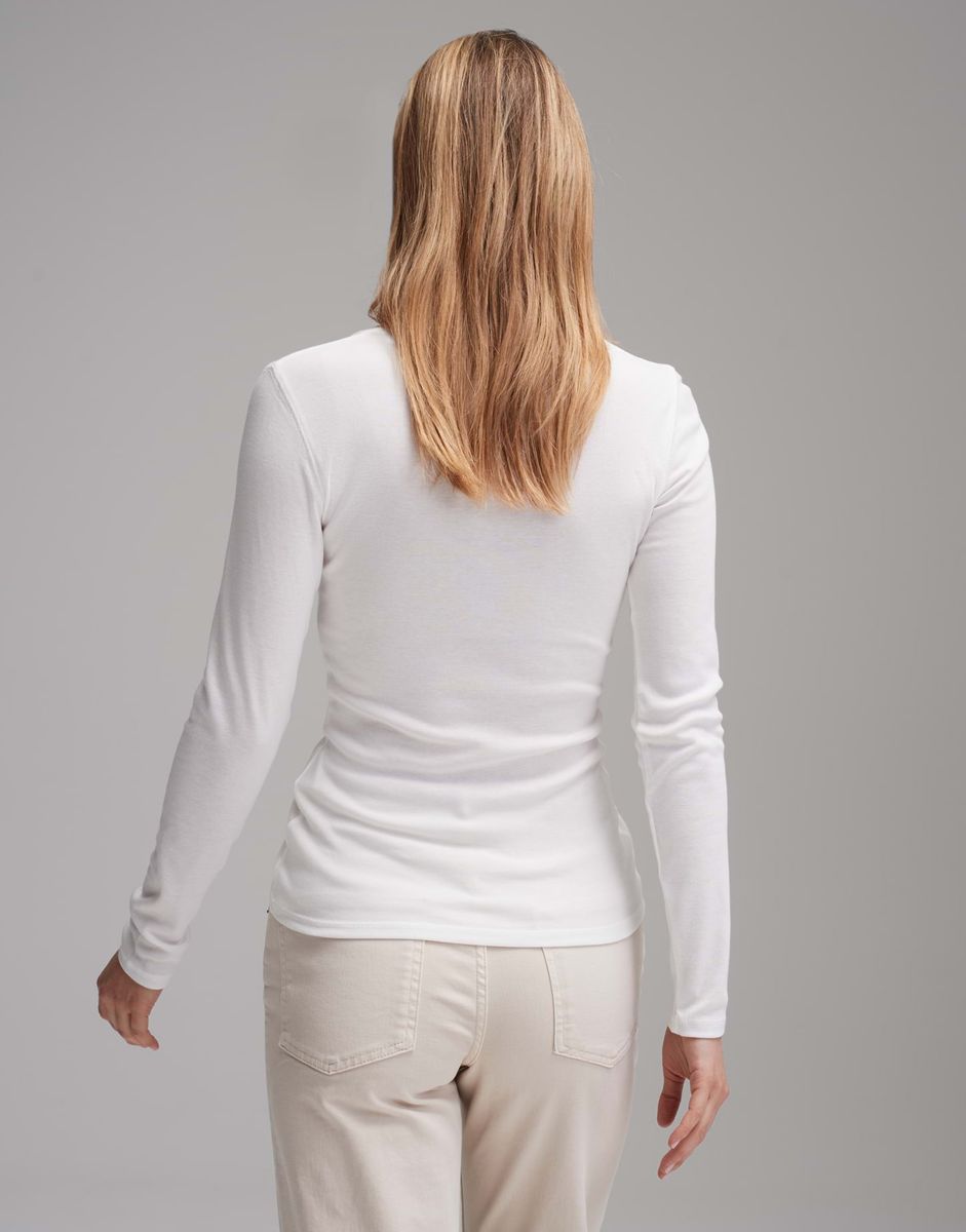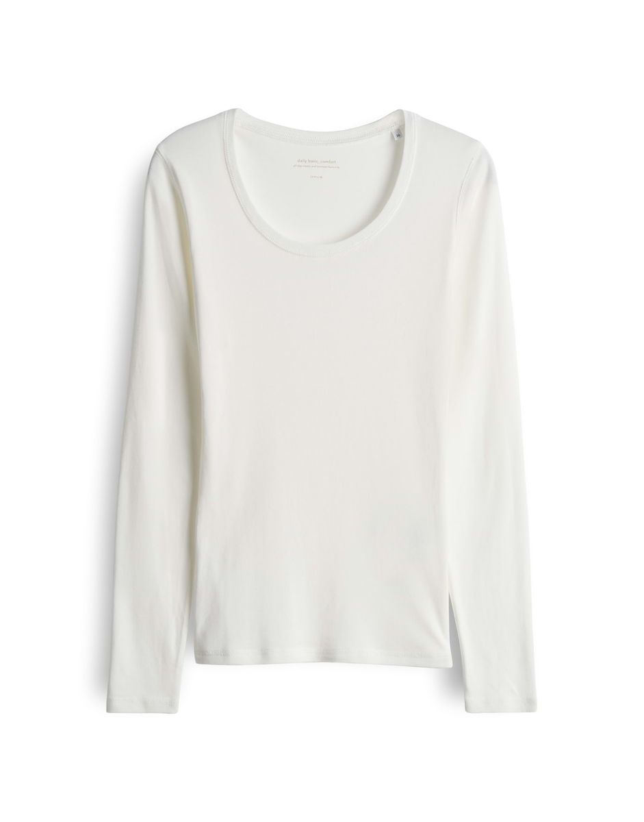 schmale Passform, weiter Rundhalsausschnitt, Langarm, Rückenlänge ca. 62 cm bei Größe 36, Model Größe 180 cm – trägt Größe 36, BCI Cotton Mix, weicher Griff, elastischer Stoff
