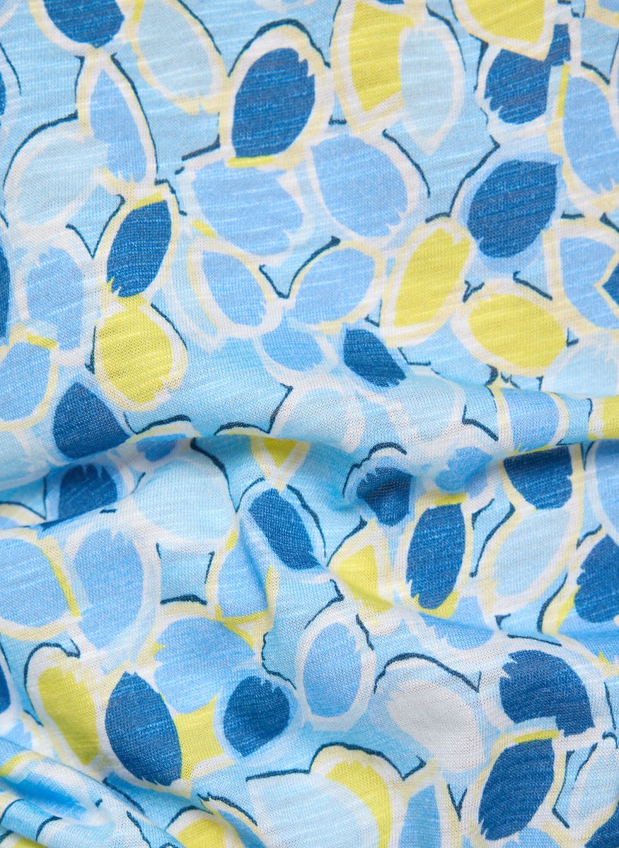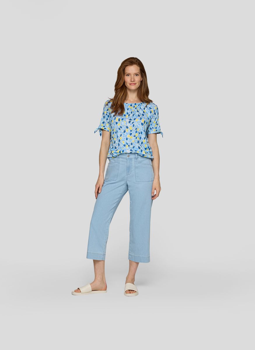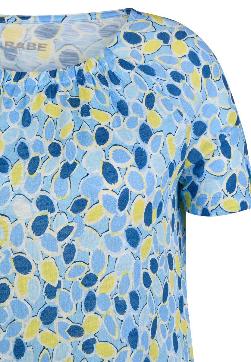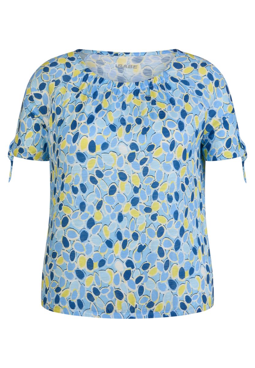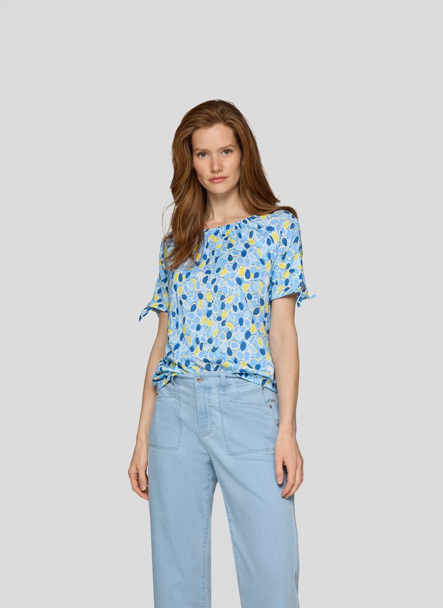 Dieses Shirt überzeugt mit einem frischen, abstrakten Print und liebevoll gestalteten Details. Der locker fallende Schnitt und die Bindebänder an den Ärmeln machen es zu einem charmanten Begleiter für warme Tage.Allover-Print in lebendiger Farbkomposition.Rundhalsausschnitt mit feiner Raffung für eine feminine Note.Kurze Ärmel mit dekorativen Bindebändern.Weiche, luftige Jersey-Qualität.Angenehm zu tragen und vielseitig kombinierbar.