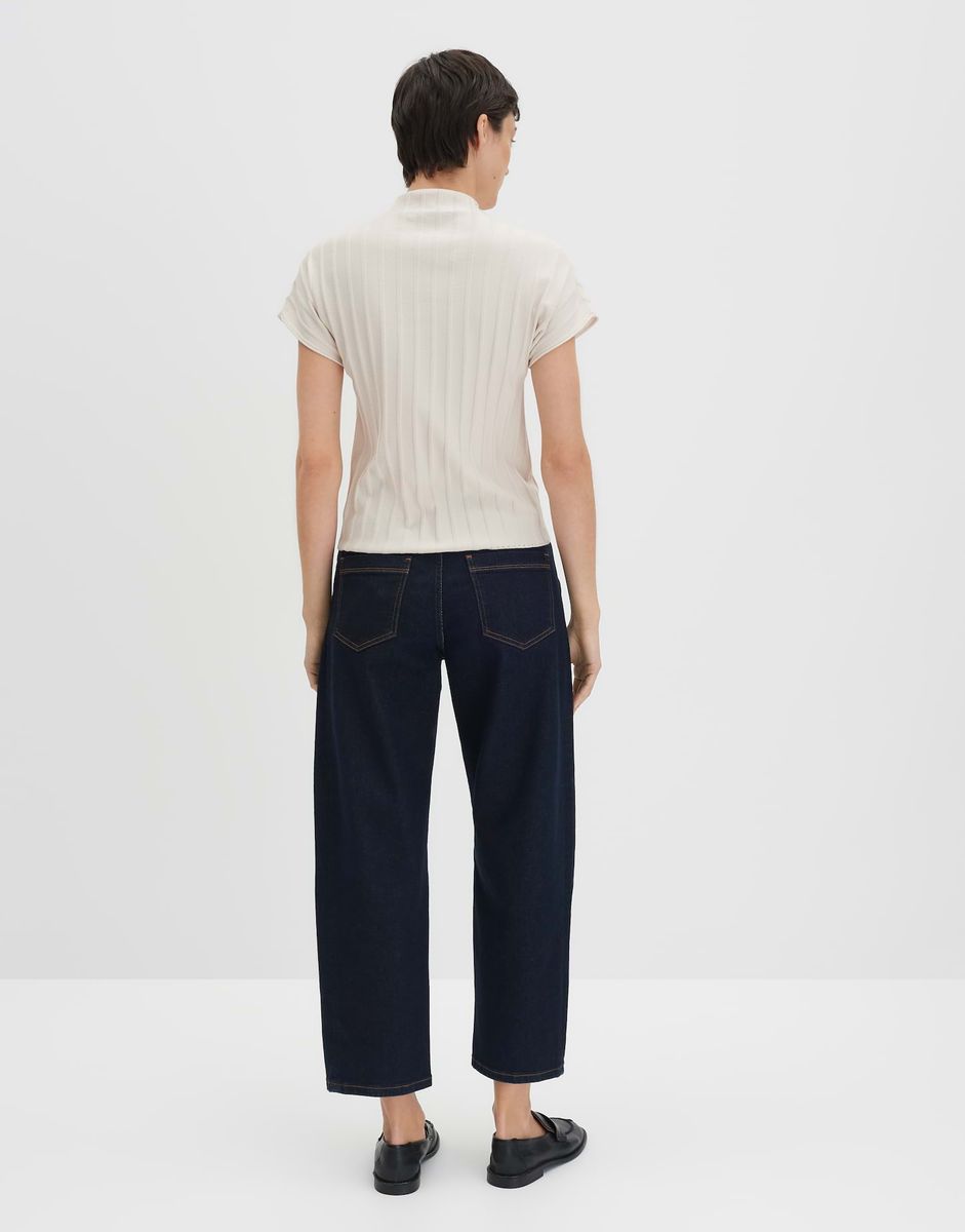 schmale Passform, gerader Schnitt, normale Länge, überschnittener Kurzarm, Stehkragen, Rückenlänge ca. 56 cm bei Größe 36, Model Größe 176 cm – trägt Größe 36, Feinstrick, feine Rippstruktur, weicher Griff, elastischer Stoff
