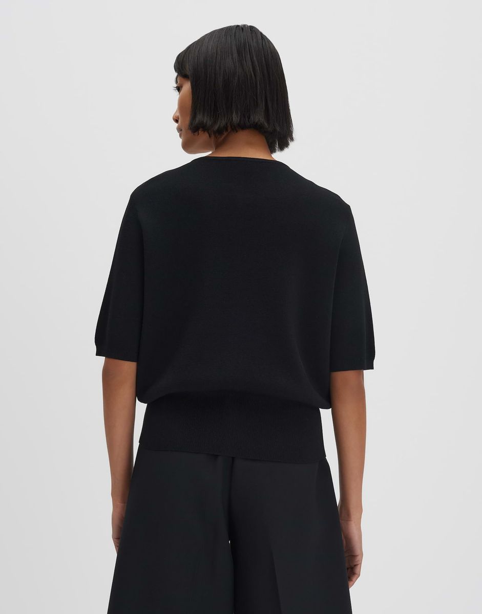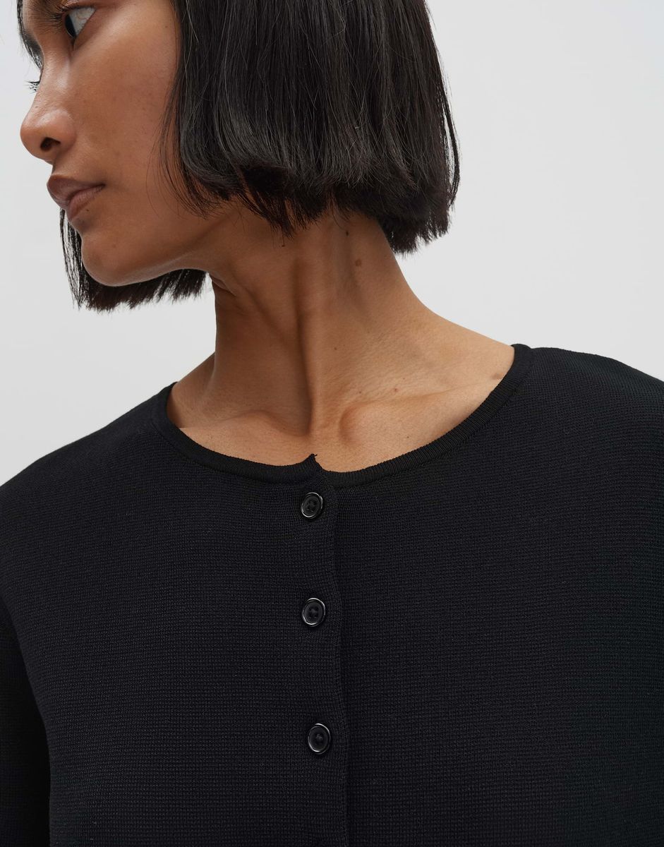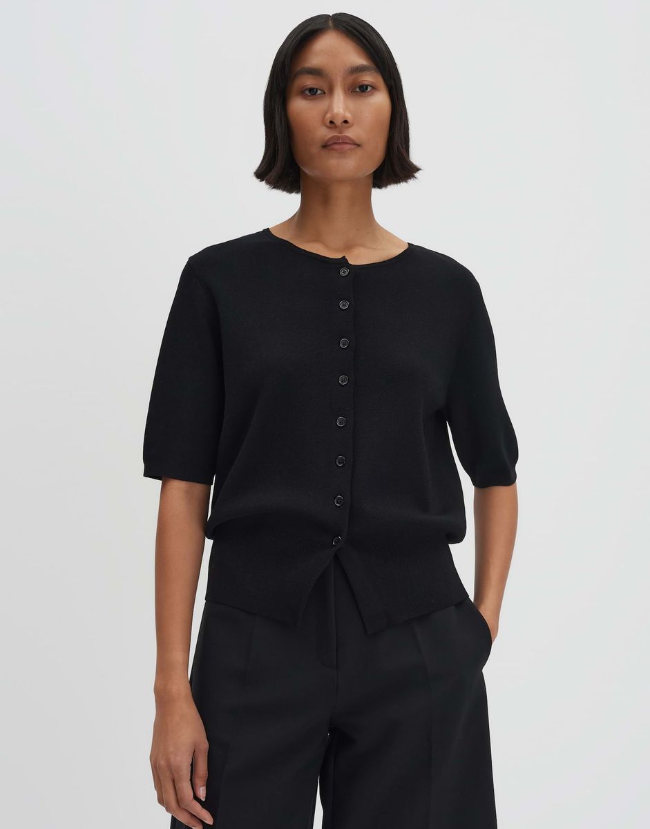 figurbetonte Passform, gerader Schnitt, Halbarm, hoher Rundhalsausschnitt, Rückenlänge ca. 55 cm bei Größe 36, Model Größe 178 cm – trägt Größe 36, Feinstrick, natürlicher Griff, formstabil, breiter Ripp-Saum, Knopfleiste vorn