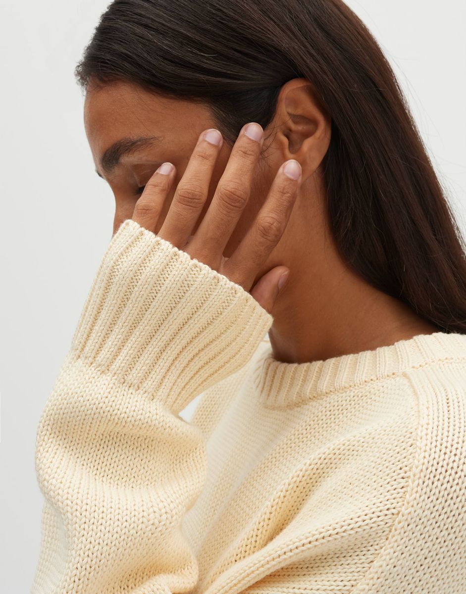 lockere Passform, gerader Schnitt, Langarm, Rundhalsausschnitt, Rückenlänge ca. 56 cm bei Größe 36, Model Größe 176 cm – trägt Größe 36, Feinstrick, weicher Griff, wärmend, Strickbündchen