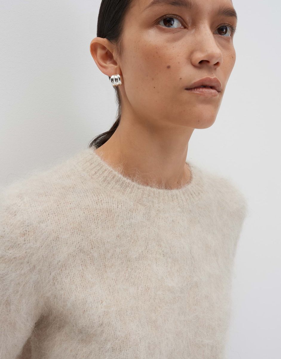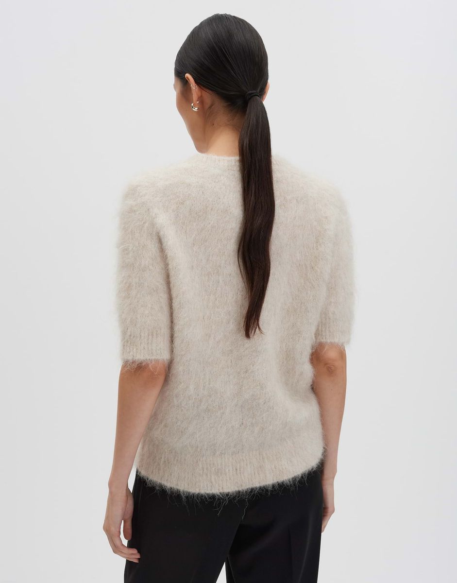 normale Passform, gerader Schnitt, Kurzarm, Rundhalsausschnitt, Rückenlänge ca. 54 cm bei Größe 36, Model Größe 177 cm – trägt Größe 36, Strick, weicher Griff, gebürstete Oberfläche, weich fließender Fall, schmale Rippbündchen