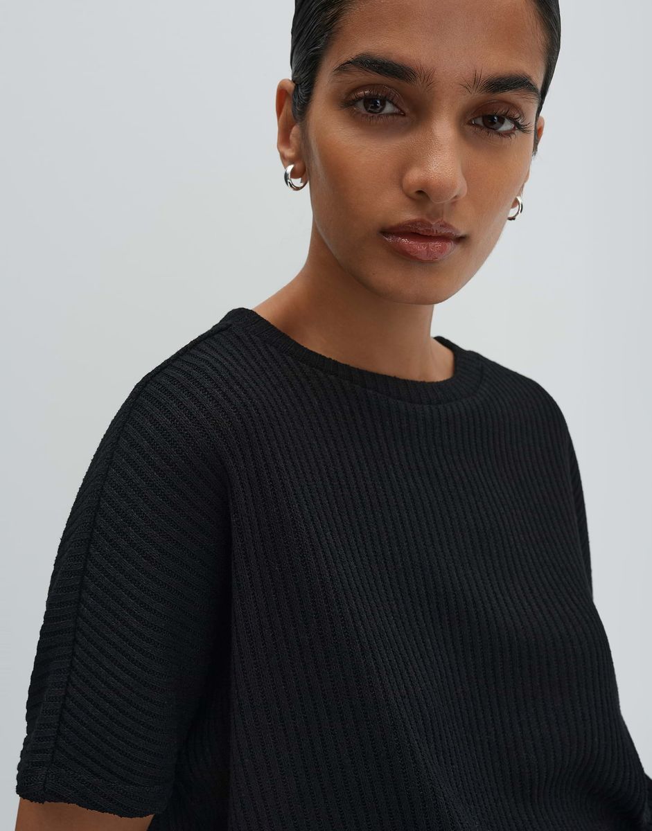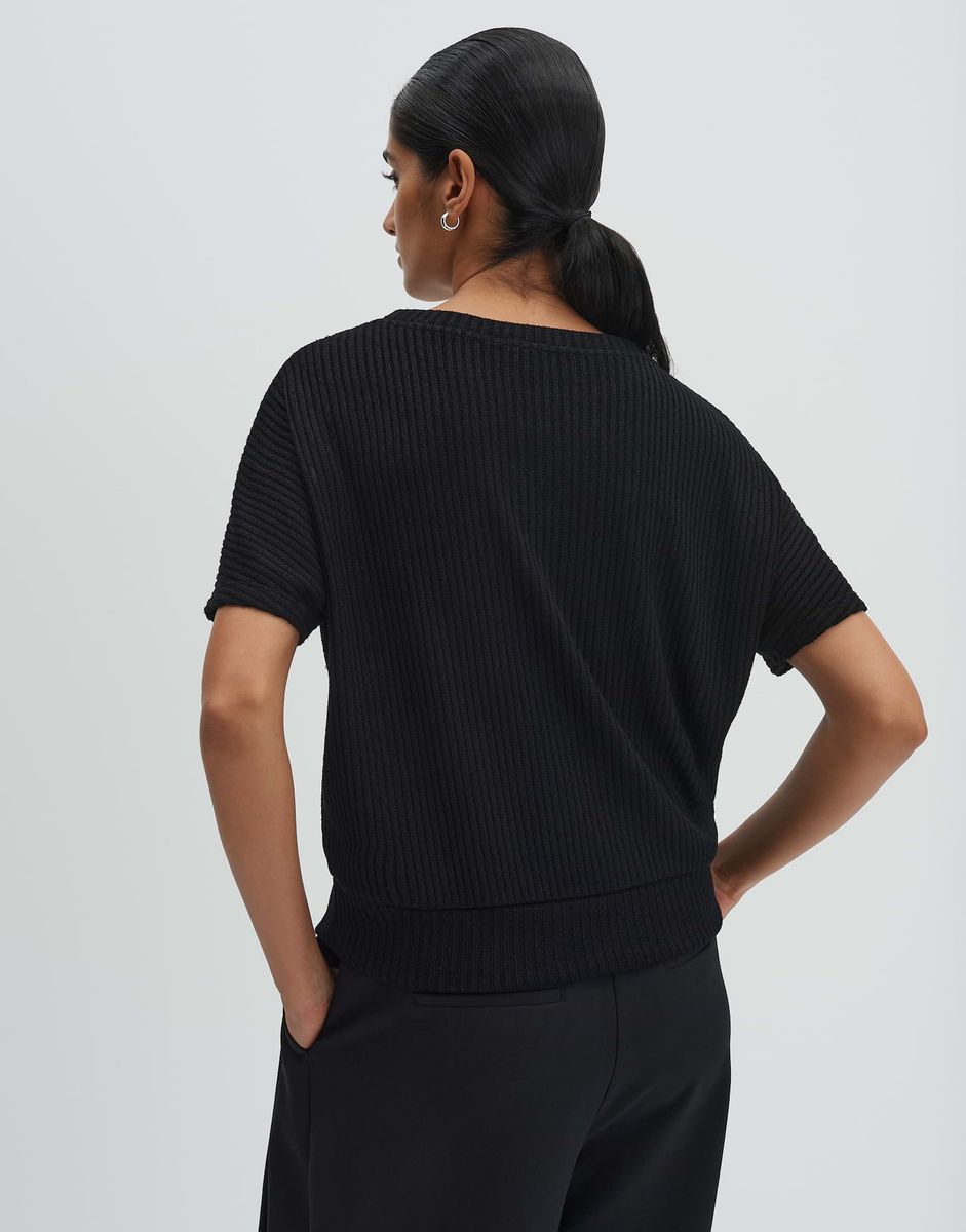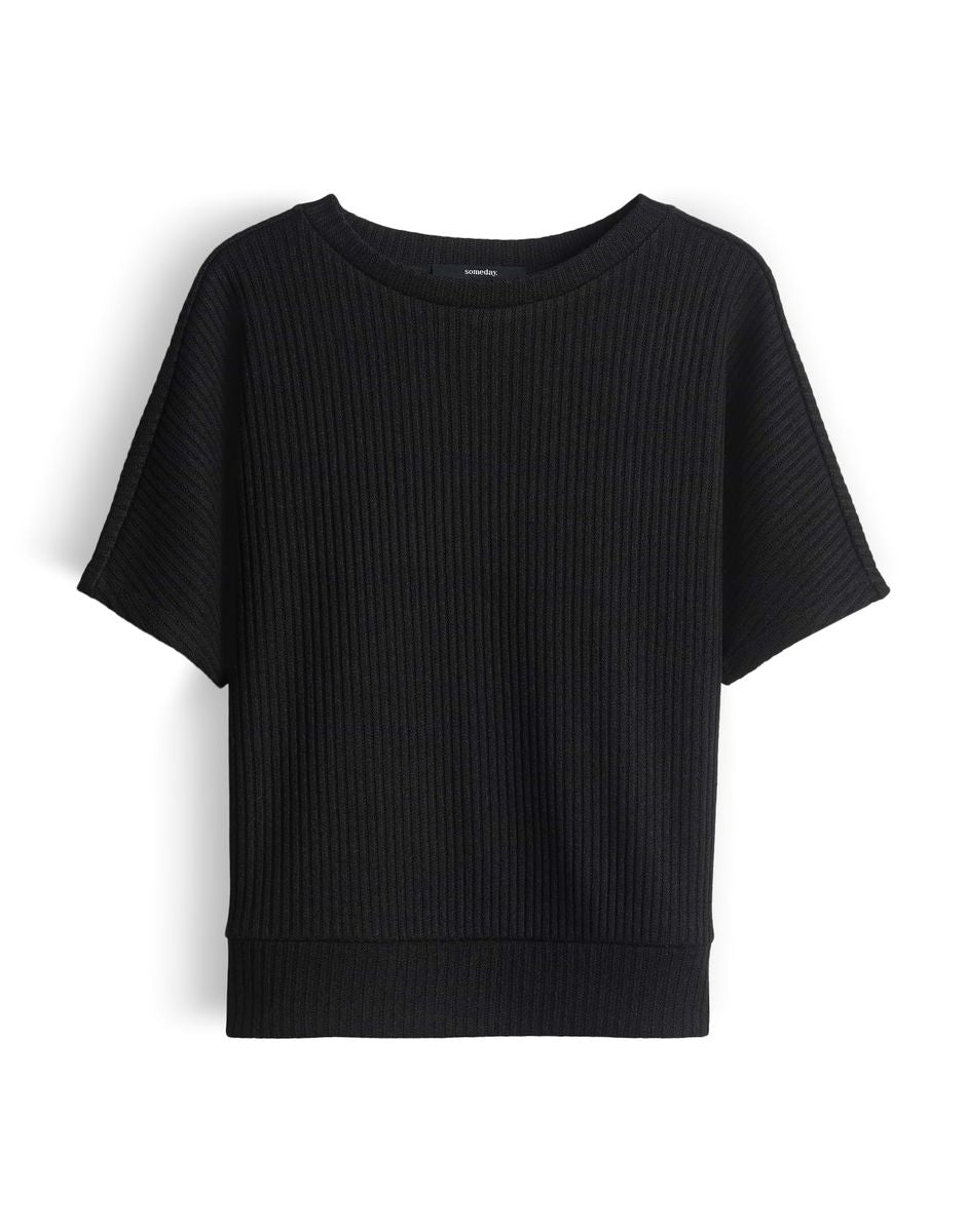 lockere Passform, schmal zulaufend, überschnittener Kurzarm, Rundhalsausschnitt, Rückenlänge ca. 54 cm bei Größe 36, Model Größe 173 cm – trägt Größe 36, Sweatware, Rippstruktur, weicher Griff, elastisch, breiter Saum