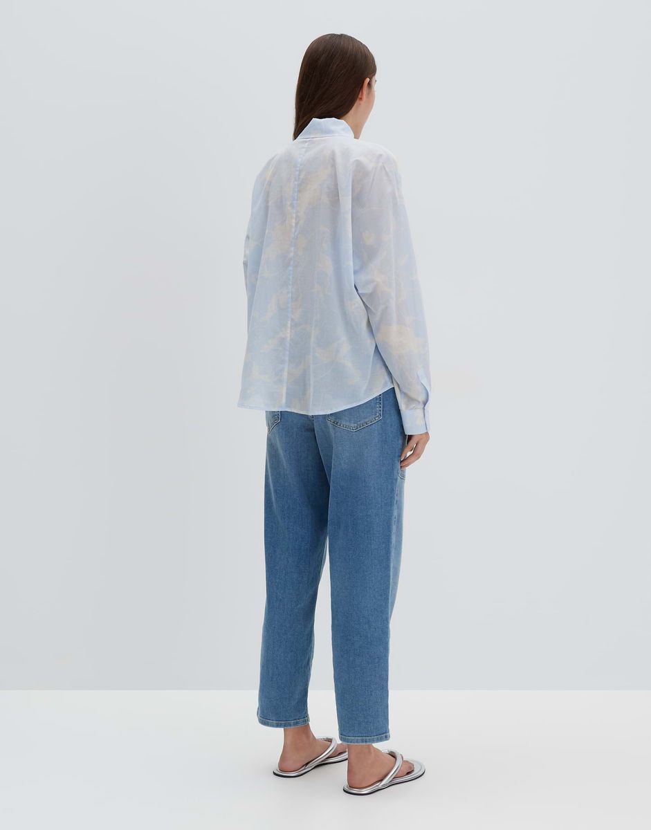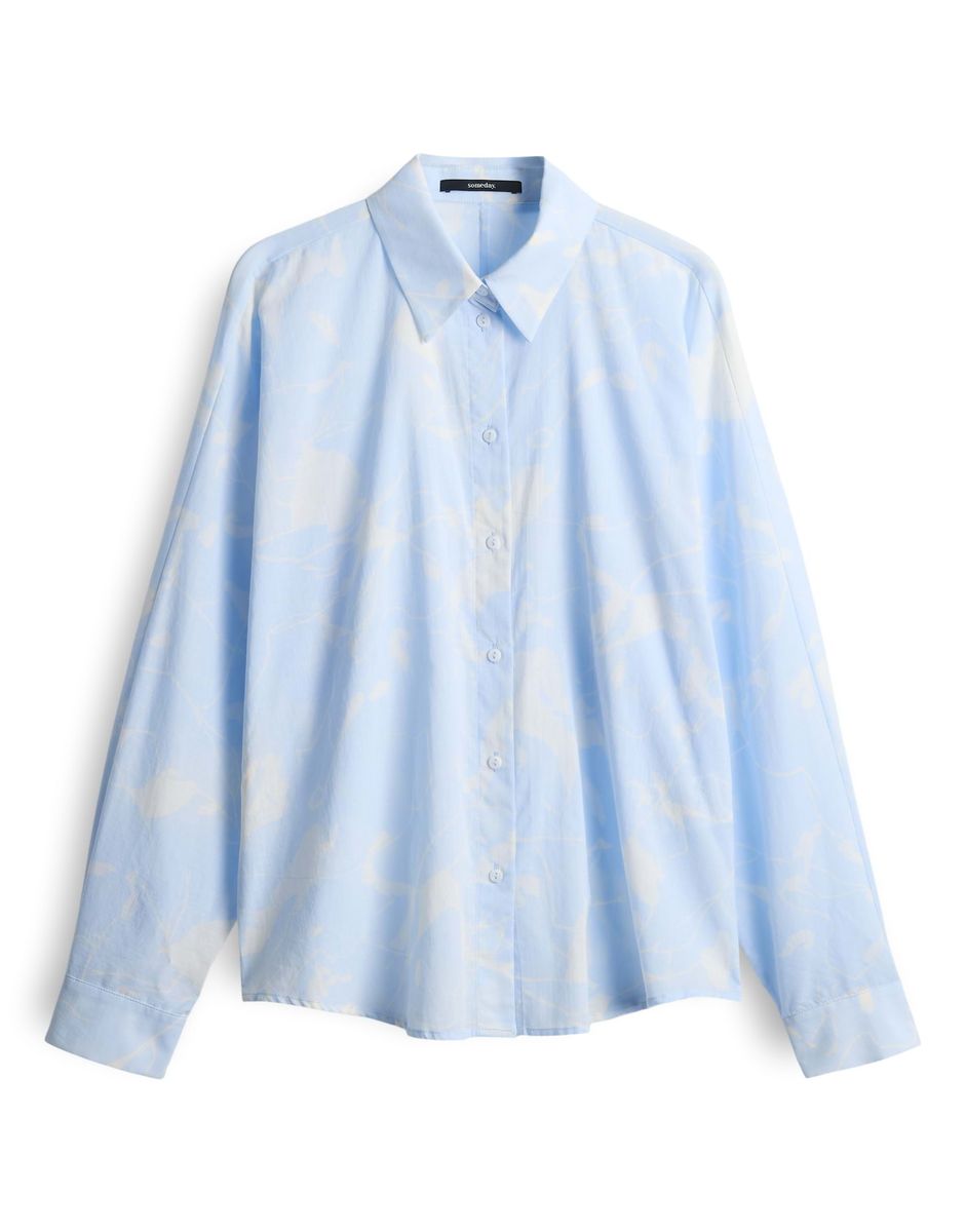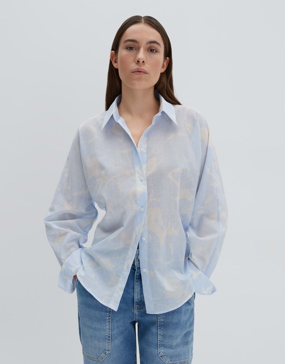 lockere Passform, gerader Schnitt, lang geschnitten, überschnittener Langarm, Rückenlänge ca. 66 cm bei Größe 36, Model Größe 177 cm – trägt Größe 36, Webware, enthält nichttextile Teile tierischen Ursprungs, dezente Struktur, leichter Stoff, leichte Transparenz im hellen Farbton, abstrakter Print, abgerundeter Saum, lange Knopfleiste, klassische Manschetten, Teilungsnähte im Rücken