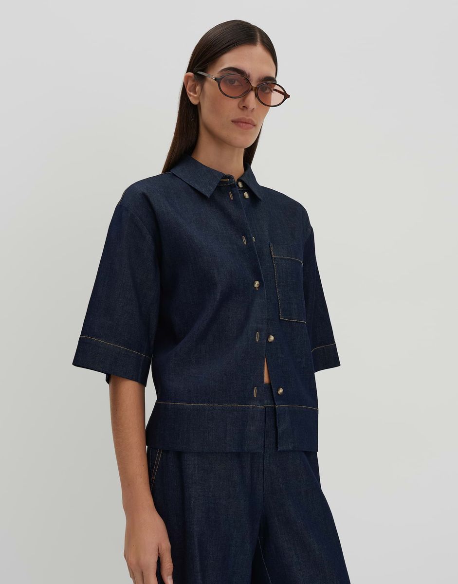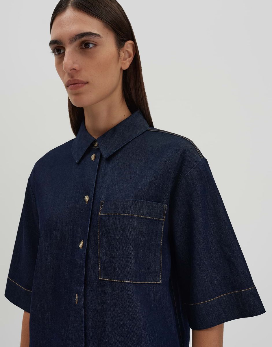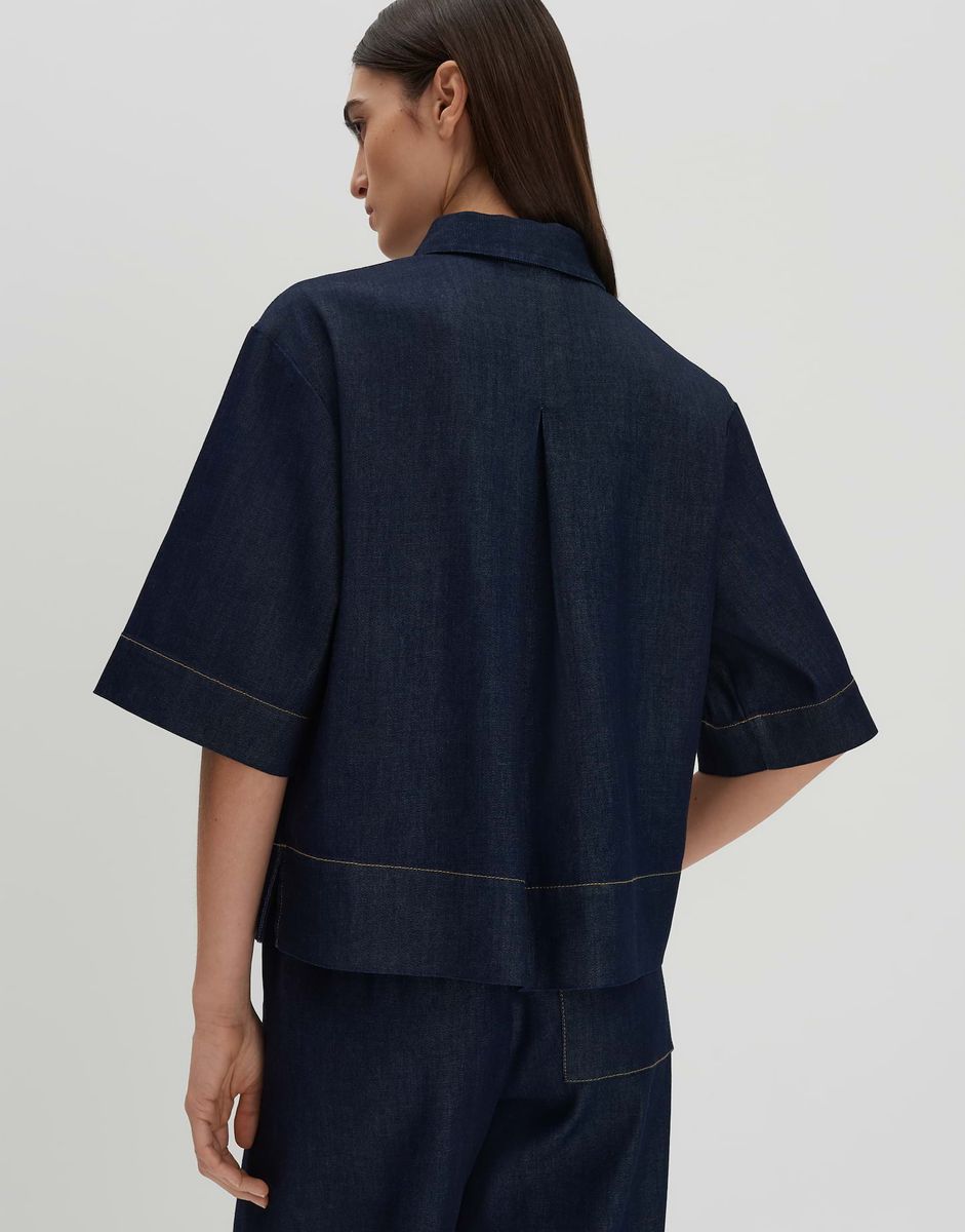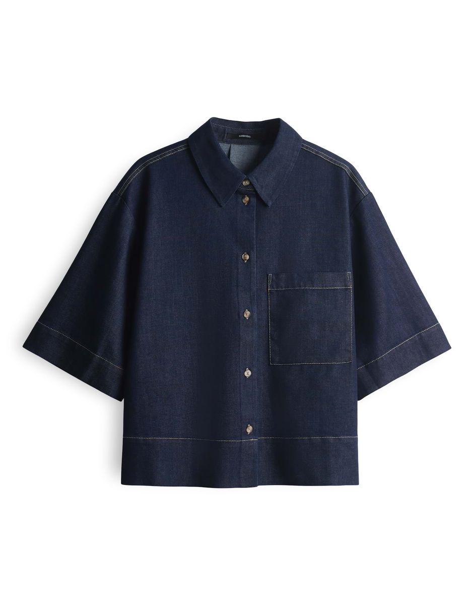 weite Passform, Boxy Silhouette, leicht verkürzt geschnitten, überschnittene Schulter mit Halbarm, Hemdblusenkragen, Rückenlänge ca. 58 cm bei Größe 36, Model Größe 176 cm – trägt Größe 36, Denim, dezente Twillstruktur, weicher Griff, formstabil, aufgesetzte Tasche, Kellerfalte im Rücken, lange Knopfleiste, Schlitze in den Seiten, kontrastfarbene Nähte, Knöpfe in Hornoptik