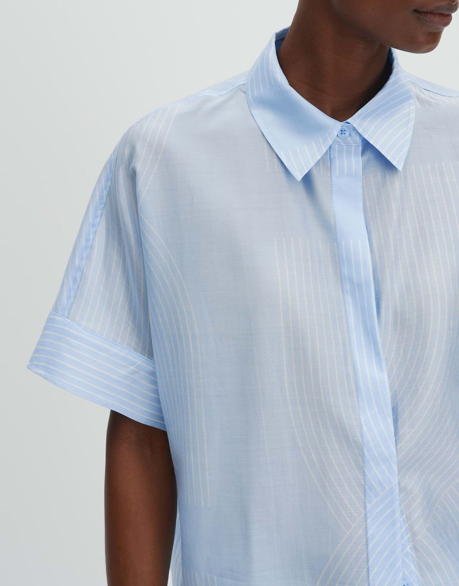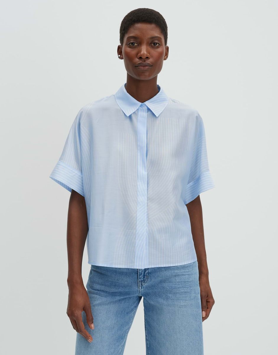 weite Passform, gerader Schnitt, verkürzte Länge, überschnittener Kurzarm, Hemdblusenkragen, Rückenlänge ca. 61 cm bei Größe 36, Model Größe 175 cm – trägt Größe 36, Satin, Webware, seidiger Griff, fließender Fall, grafisches Muster, verdeckte Knopfleiste, Passe im Rücken, breite Manschetten